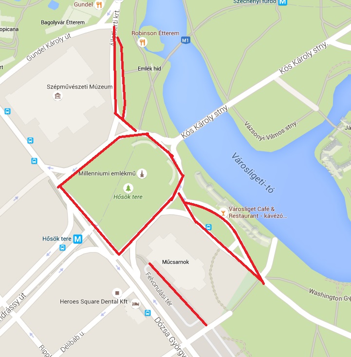 Olof Palme sétány mindkét oldalán, a Hősök tere és a Városliget között, a Műjégpálya előtti szervizúton is,