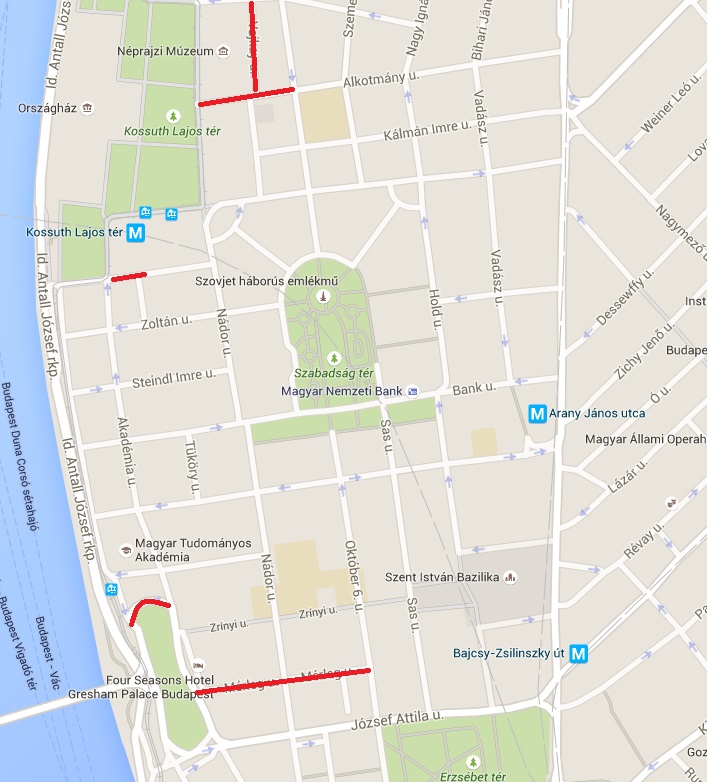 Országház utca 2. szám előtt mindkét oldalon az Alabárdos étterem előtt 50 méter hosszon,