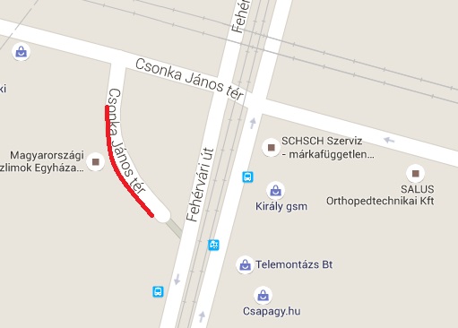 Fehérvári út 41. szám előtt a Csonka János tér köríves részén a park felől.