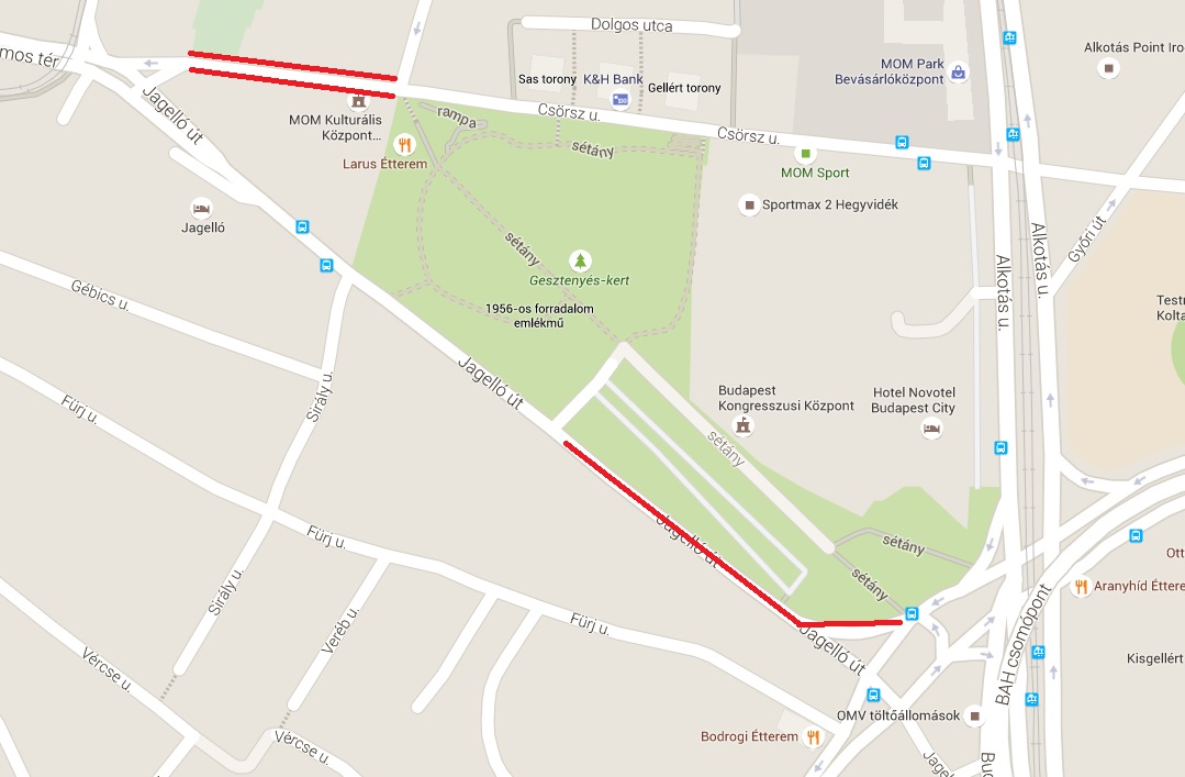 Jagelló út mindkét oldalán a BAH csomópont és a Budapesti Kongresszusi Központ parkolójának bejárata között ( a járdán kijelölt helyeken is)