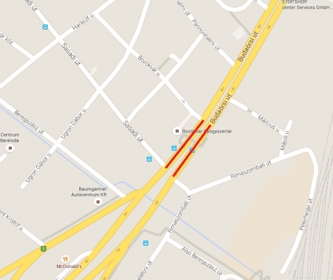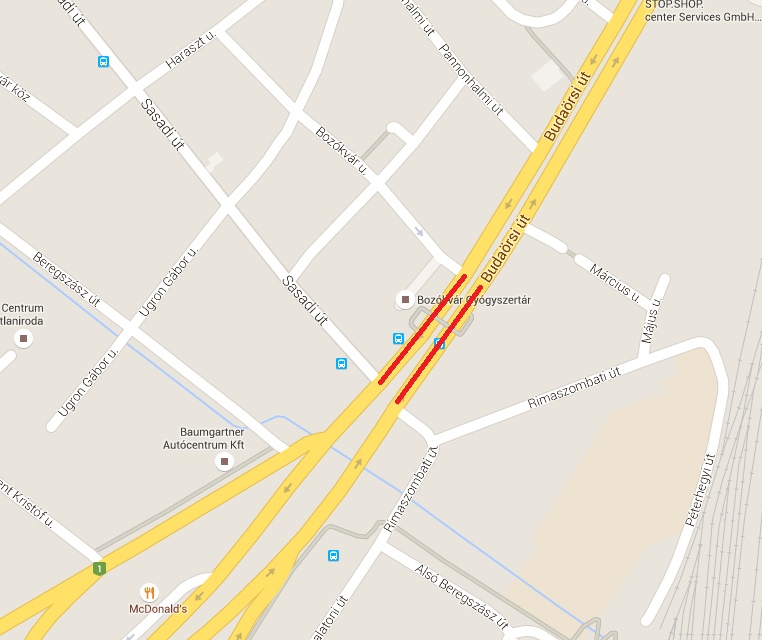 Budaörsi út a Sasadi út és a Bozókvár út közötti szakaszon teljes szélességében.