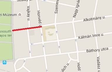 Alkotmány utca páros oldalán a Honvéd utca és a Kossuth tér között.