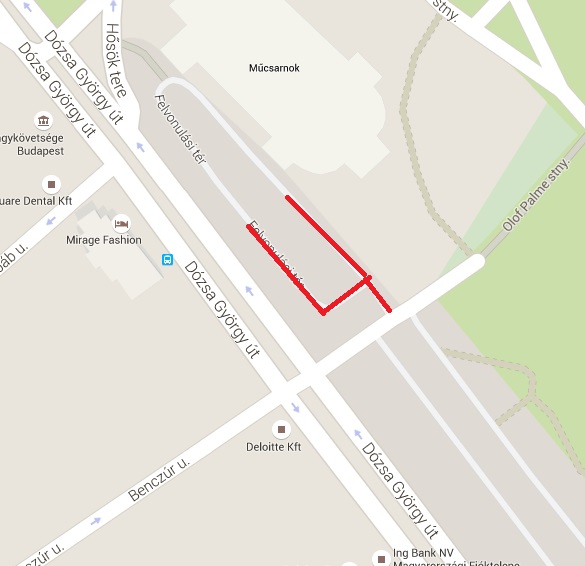 Felvonulási téren a Benczúr utca (Műcsarnok mögötti egyirányú szervizút) és az ’56-os Emlékmű között.