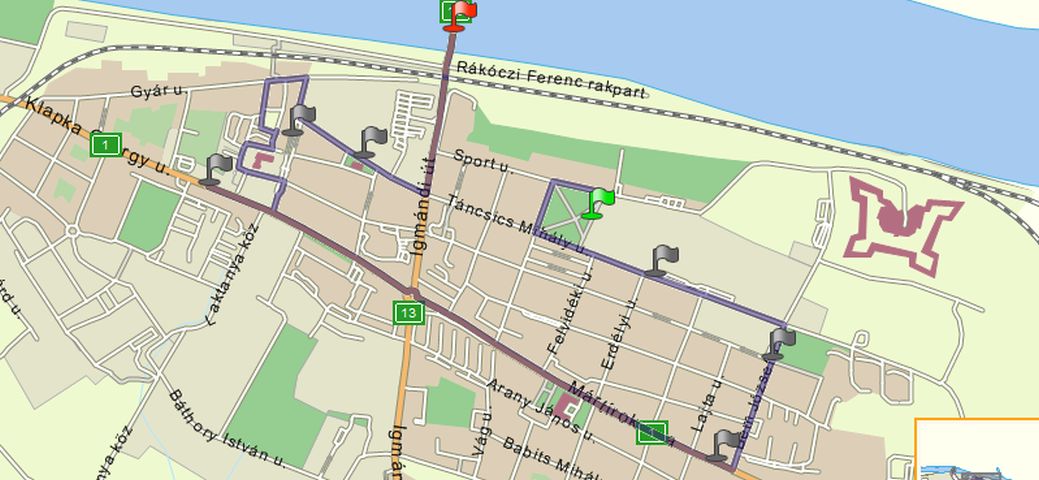 Komárom, Jókai liget – Táncsics Mihály út – Bem József utca - Mártírok útja – körgeometriás csomópont – Klapka György út – Szent László út – Bajcsy Zsilinszky utca – Igmándi út – Erzsébet-híd közötti útszakasz menetirány szerinti jobb oldali forgalmi sávját.