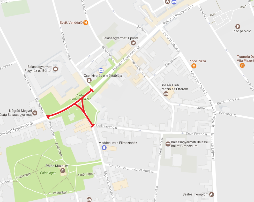 A Rákóczi fejedelem út Bercsényi utca és a Madách Imre utca közötti szakasza, valamint a Bajcsy-Zsilinszky utca Deák Ferenc utca és a Rákóczi fejedelem út közötti szakasza.