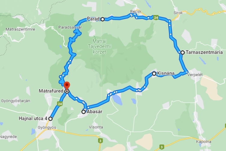 A 24-es számú főút /Gyöngyös, Bene út- Hajnal utca kereszteződése/ (RAJT) – Mátrafüred –Mátraháza – Parád – 24-es számú főút Sirok elágazó – Tarnaszentmária – Kisnána – Domoszló – Markaz – Abasár – Pálosvörösmart – Mátrafüred (CÉL).