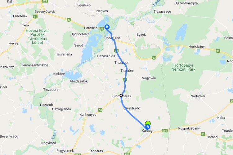 Karcag, Kossuth tér (rajt) – Madarasi út – Berekfürdő külterület 3401-es út – Kunmadaras, Karcagi út – Örsi út (34-es számú főút) – Tiszaörs, Rákóczi út – Tiszaigar, Táncsics út – Tiszafüred, Igari út – Húszöles út – 33-as számú főút Heves megye határáig.
