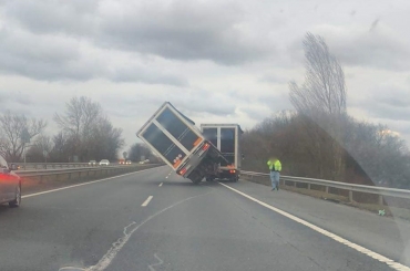 Egy kamion üres pótkocsija az erős szélben megdőlt és az út felé dőlve korlátozza az autópálya forgalmát.
